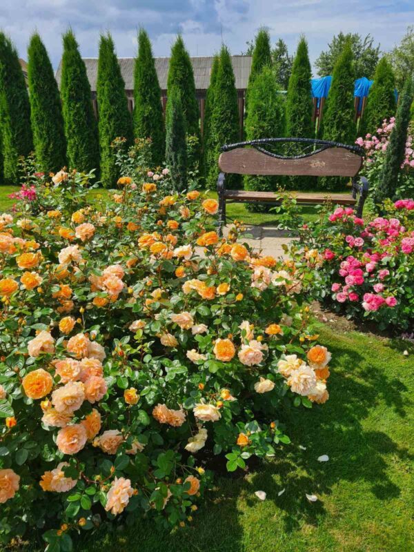 Žaliąją erdvę šalia rožyno papuošė didžiuliais gėlių vazonais, pastatė fontaną, apsodino levandomis. Tarp rožių klesti ir kelios vešlios lelijų rūšys.