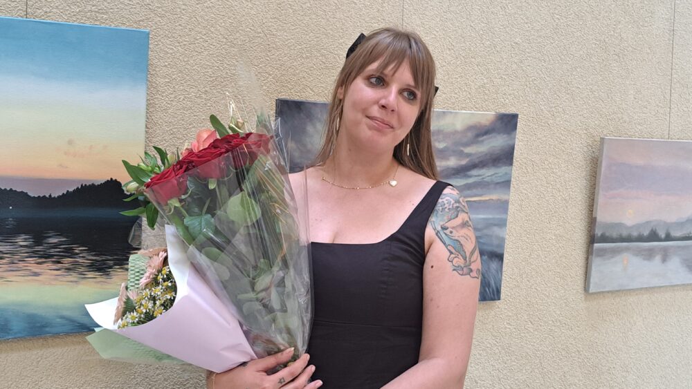 Padėkojusi visiems susirinkusiesiems, menininkė gėlių puokštes įteikė kultūros centro šeimininkui R. Matuliui, parodos organizatorei O. Valužienei. Padėkos žodžiai skriejo atidarymo renginį vedusiai Gabrielei Budrytei ir akordeonistui Edmundui Gyliui, kurio atliekama muzika suskambėjo kartu su paveikslais.