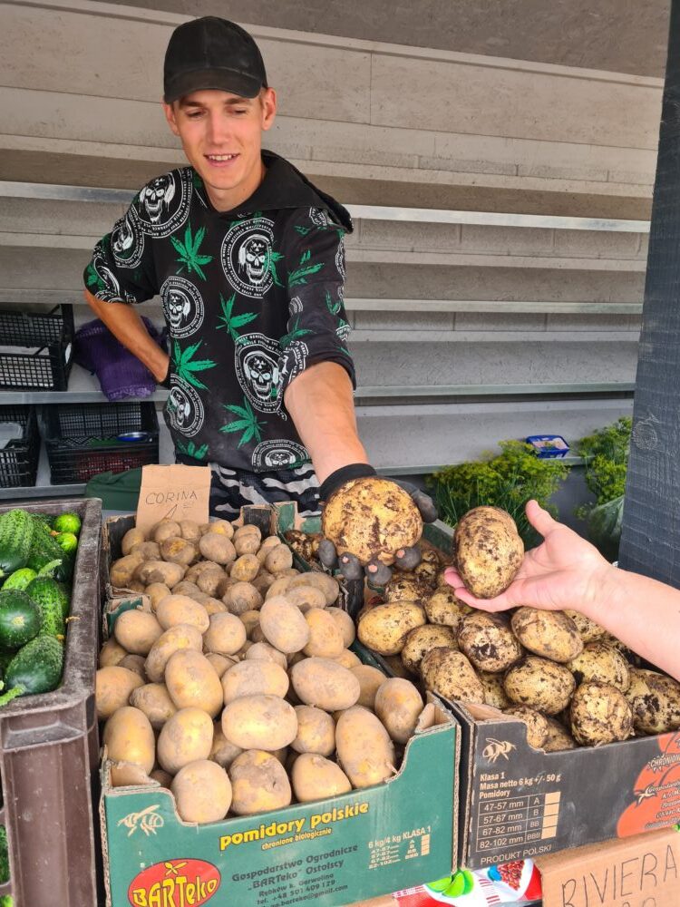 Turguje prekiaujantis jaunimas Gabija ir Domantas siūlo pirkti Luokės ūkininko užaugintų daržovių. Prekiautojai kalbėjo, jog šiemet bulvių derlius gana neblogas – bulvės didelės, vos telpančios į delną. Tačiau žmonės kažkodėl dažniau renkasi mažesnes. Per dieną jie parduodantys apie du maišus bulvių, kurių kaina svyruoja nuo 1 iki 1,20 Eur už kilogramą.