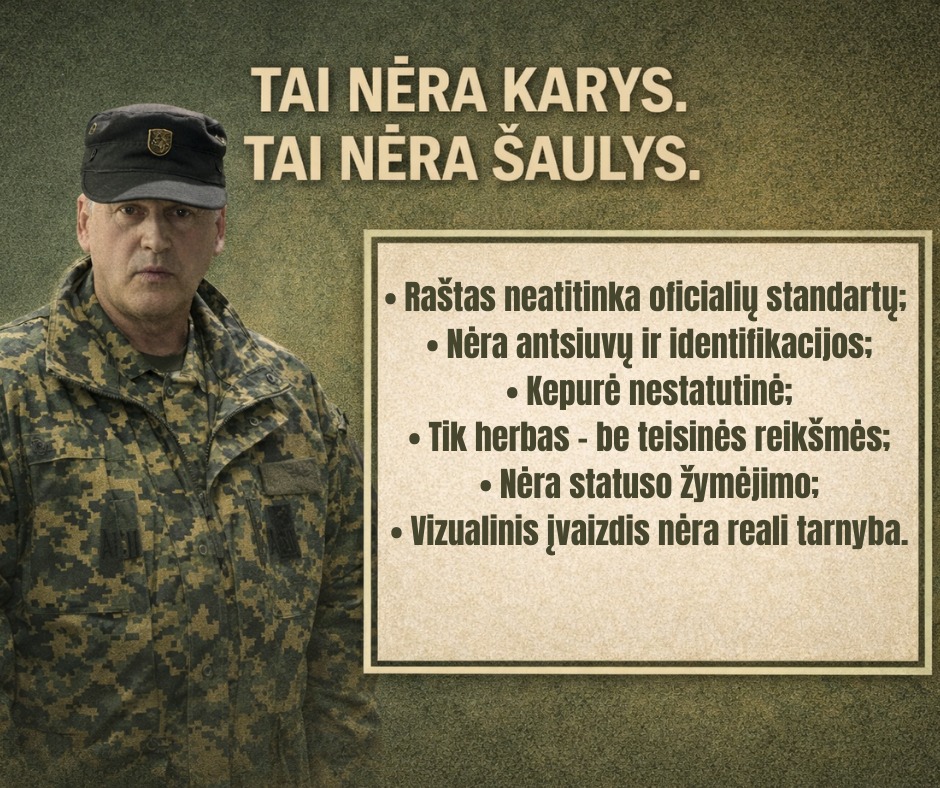 Žemaitijos šaulių 8-osios rinktinės vadas Julius Svirušis pasidalijo buvusio Lietuvos kariuomenės vado Arvydo Pociaus įžvalgomis, kur jis atkreipia dėmesį, kad Lietuvoje galioja aiškūs teisės aktai, reglamentuojantys uniformų dėvėjimą.