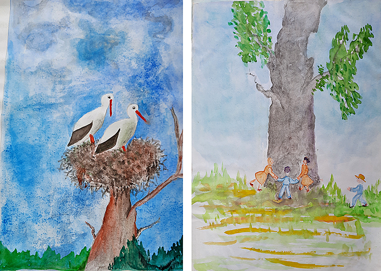 Nupaišiau mums tėvo padirbintą karuselę. Žiemai ant prūdo visada buvo pastatoma sūkynė. Ir ją nupaišiau. Nupaišiau ir medį su dideliu gandralizdžiu. Nupaišiau ir mus visus keturis, bandančius apkabinti storiausią kiemo liepą, – mes jau susikibę, o mažasis tik atbėga.